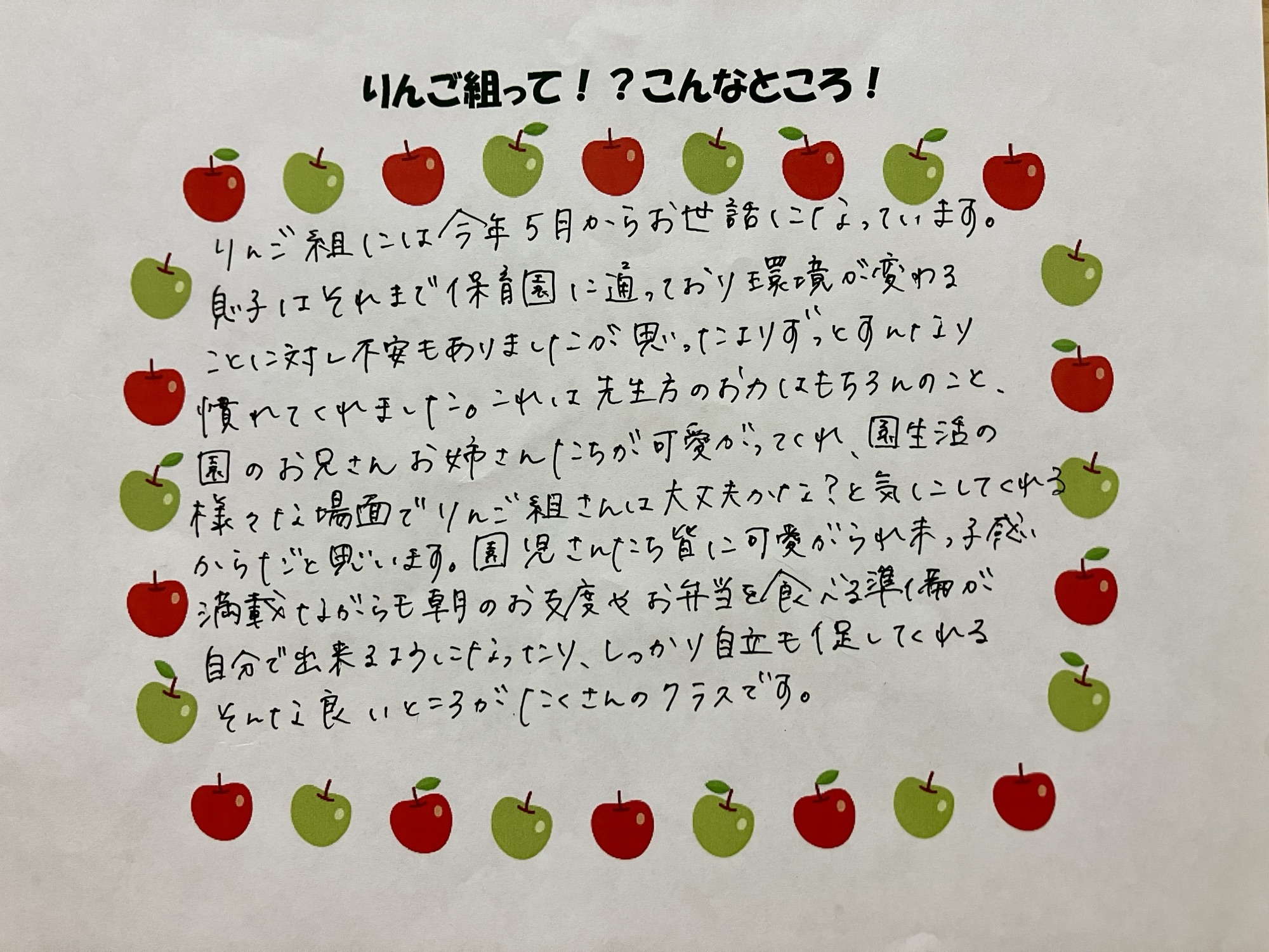 今年度、入会された保護者の方に「2歳児クラス(りんご組)」はどんなところ!?とお聞きしました。