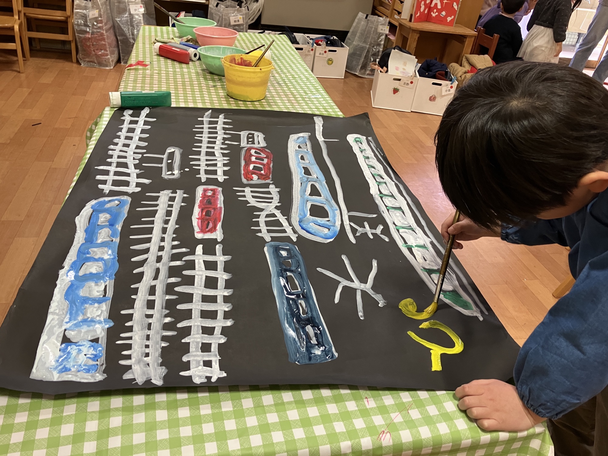 電車が大好きな年長さんは、新幹線🚄、東横線、目黒線、相鉄線を鼻歌を歌いながら描きました🚃 仕上げはサイン入り✍️