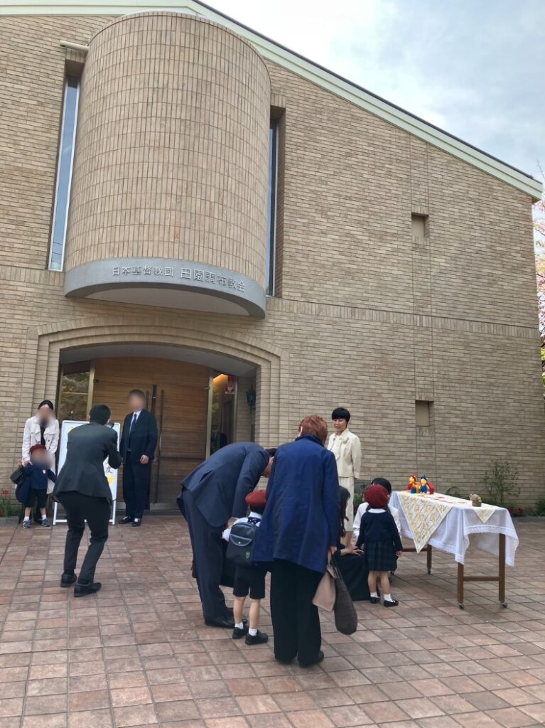 桜吹雪が舞う中、入園式を迎えました🌸入園式は、田園調布教会で行われます。りんご組に通っていた友だちも教会は初めてでしたのでドキドキしたね。