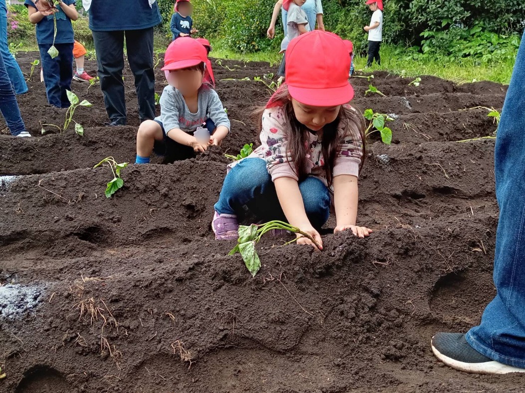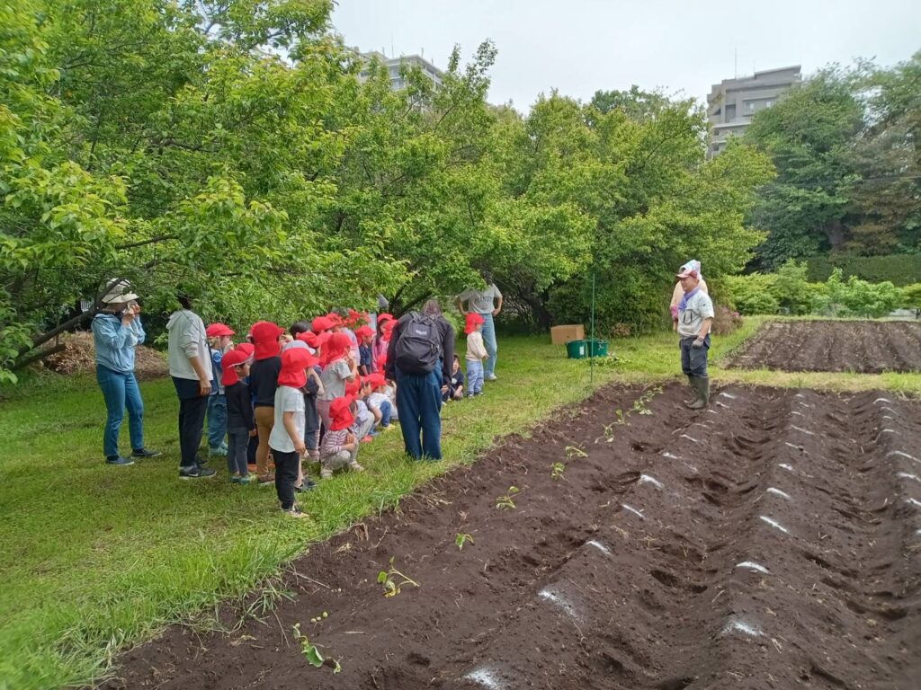 畑ではオーナーのご夫妻が準備して迎えてくださり、植え方を教えていただいて早速挑戦!