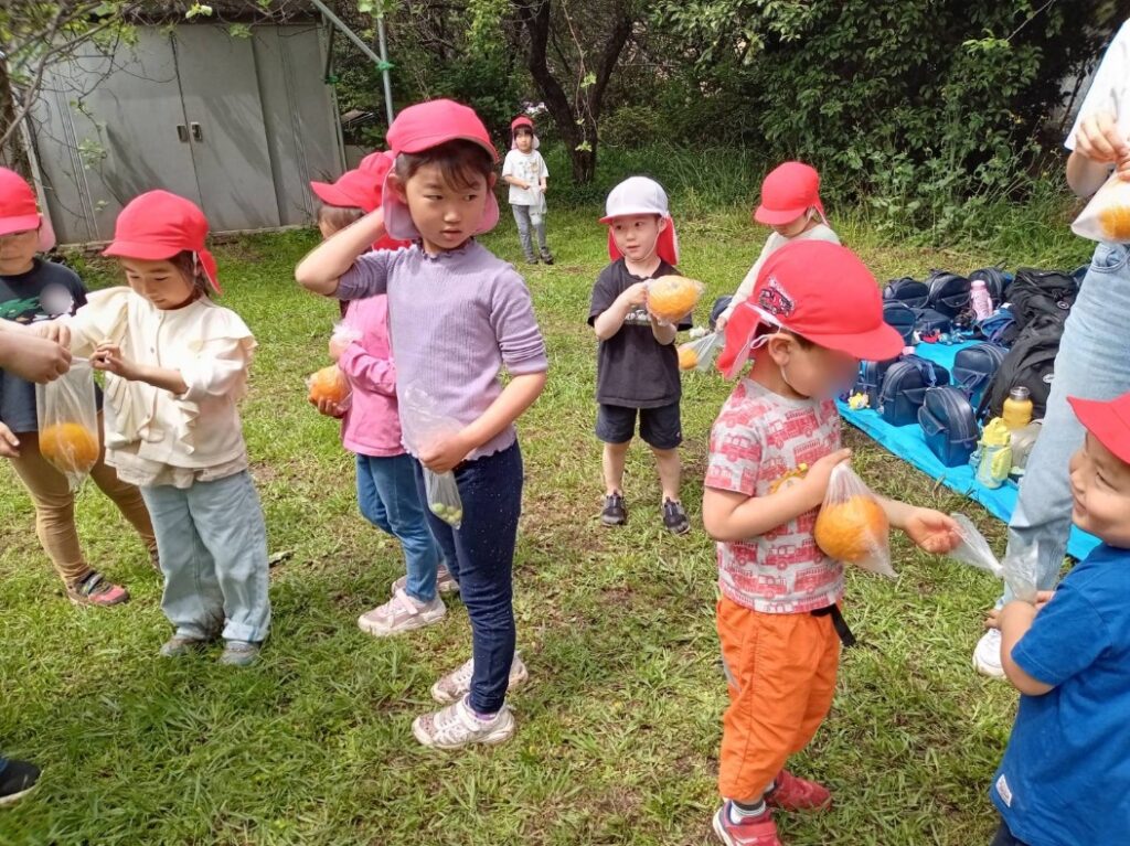 その後、畑で夏みかんや梅の実を拾ったり、畑の虫探しに夢中になっていた子どもたち。