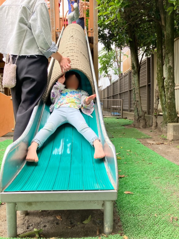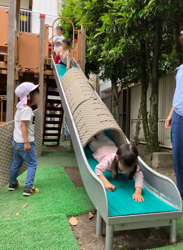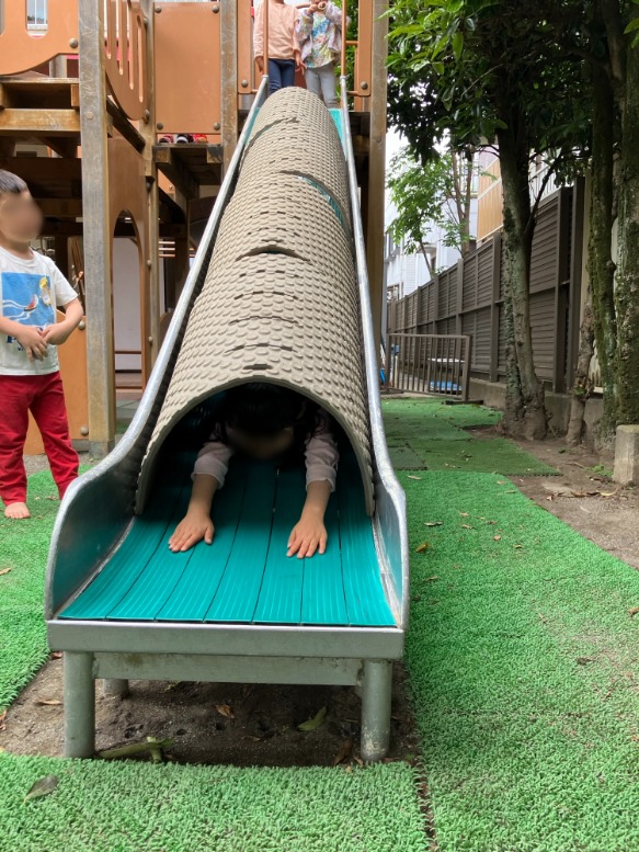 登園初日はおうちの方と一緒に過ごします。そのお母さんがトンネルを設定してくださり、年中さんも大喜び🙌
