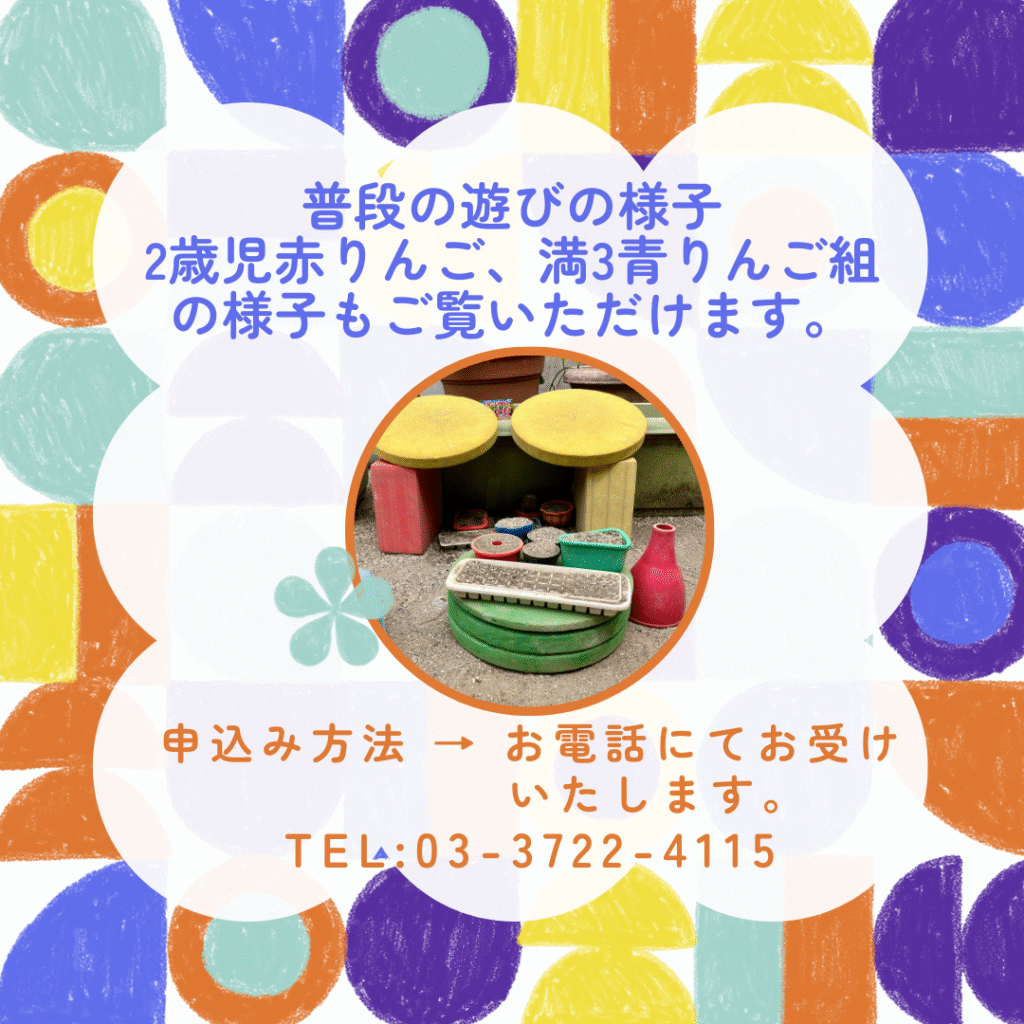 普段の遊びの様子、年少~年長組、🍎2歳児りんご組、🍏満3青りんご組の様子をご覧いただけます。