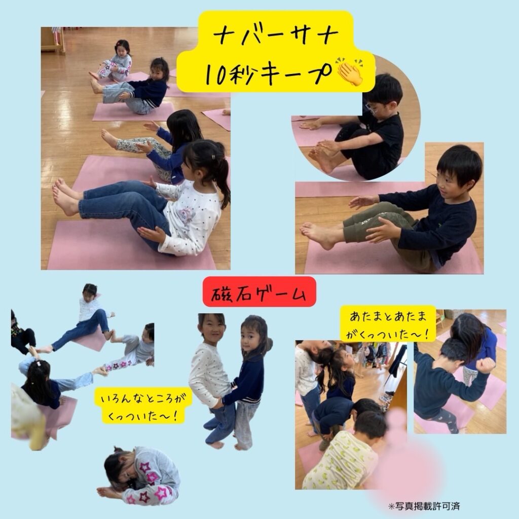 ゲームでは、磁石に変身し、ピアノに合わせて、お友だちと体を合わせる遊びをしました😊♪
