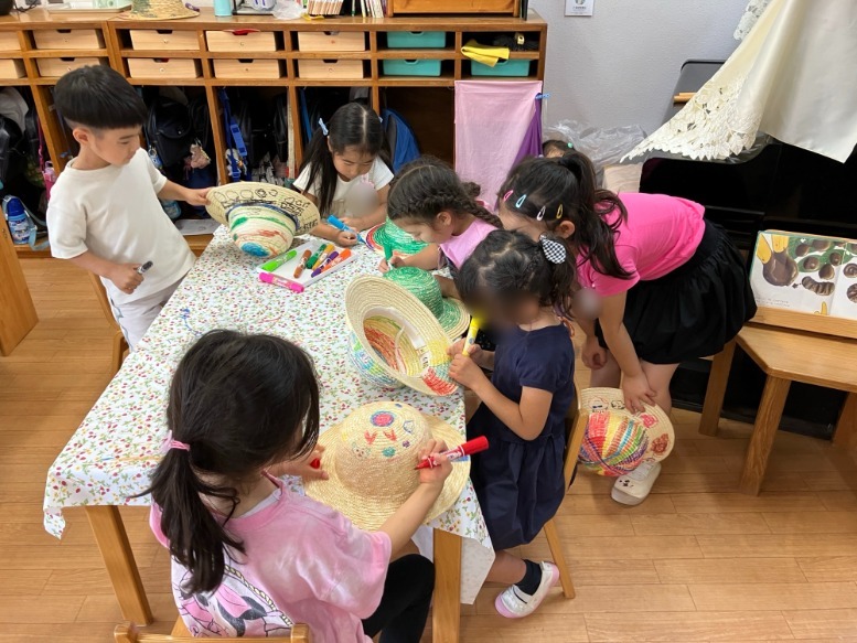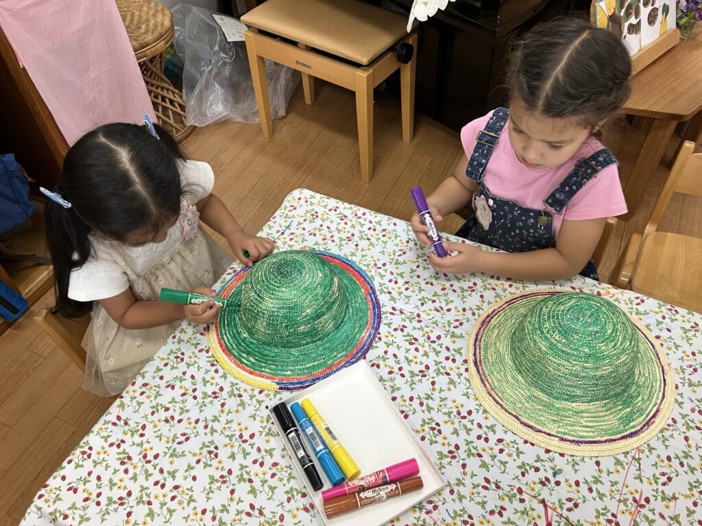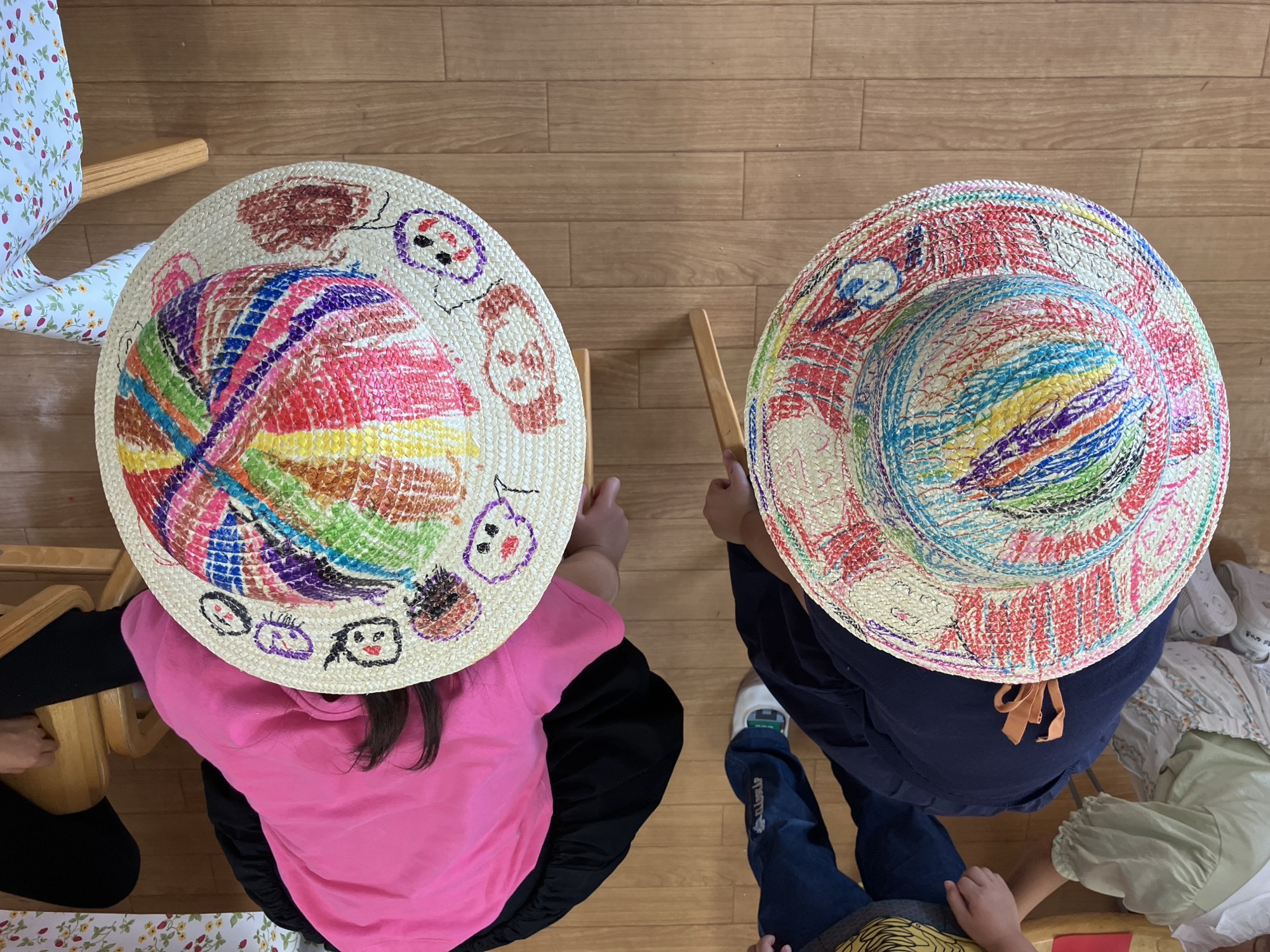 今週はキャンプに被って行く“麦わら帽子👒”に絵を描いたり、色を塗りました。