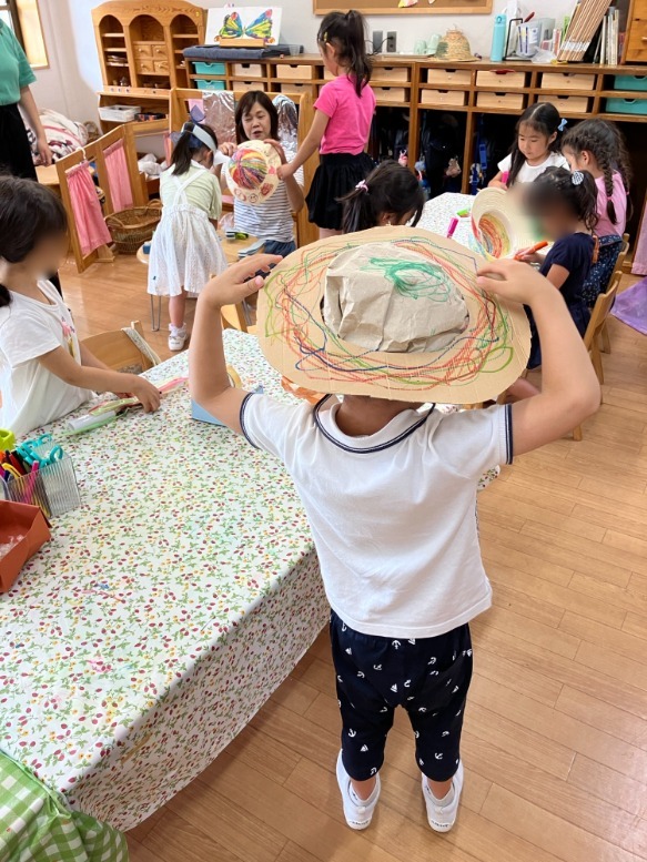 麦わら帽子が羨ましくて、先生と一緒に段ボールと包装紙で作った年中さん👍 来年、描こうね!