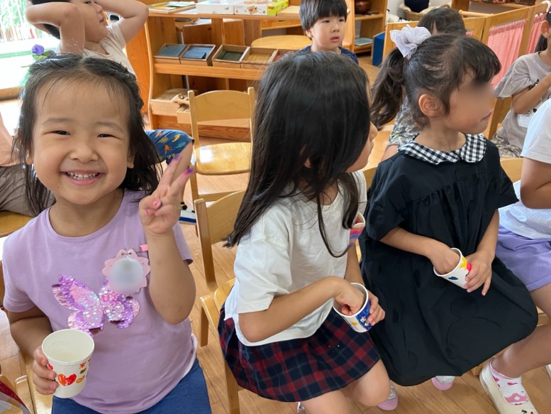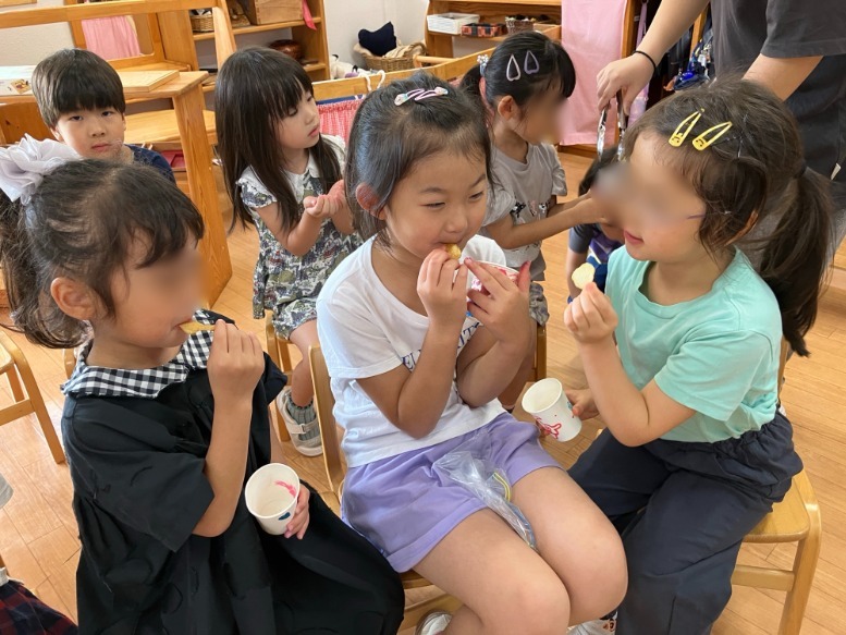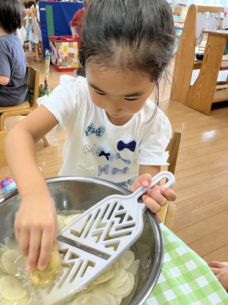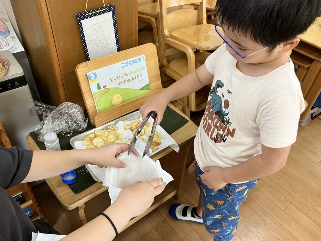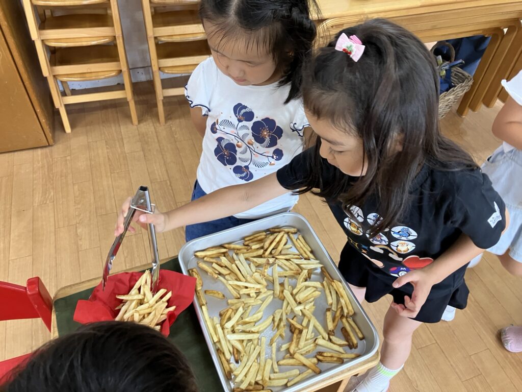 「さぁ、どうやってたべようか!?」クラスで相談した結果、ポテトフライ🍟に決まり、降園前に味わいました。「もっと食べたーい!」の大合唱(^^♪