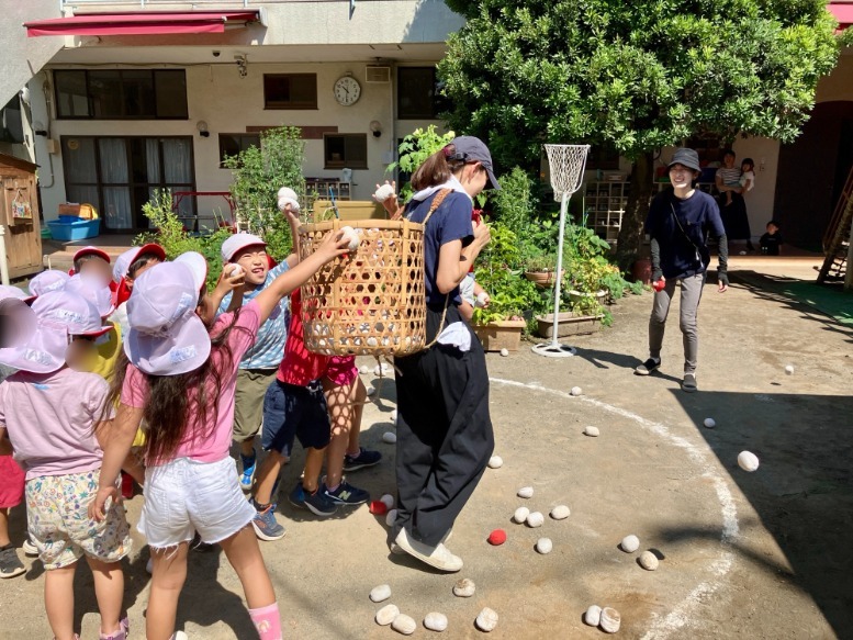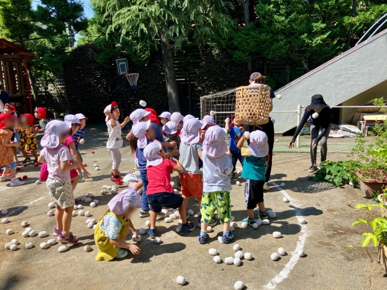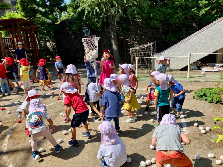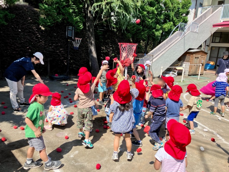 先日、みんなで玉入れをしました。年少組は初めての経験です!大きいお兄さん、お姉さんと一緒に赤白の玉をカゴに向けて投げました。