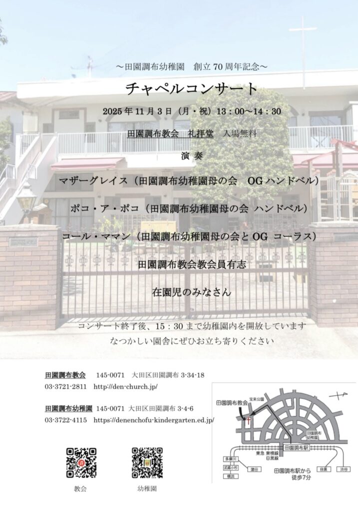 卒園生の皆さま、創立70周年記念~チャペルコンサート~にどうぞおいでください。心よりお待ちしております。コンサート終了後は、幼稚園内を開放しております。懐かしい園舎にぜひ、お立ち寄りください。