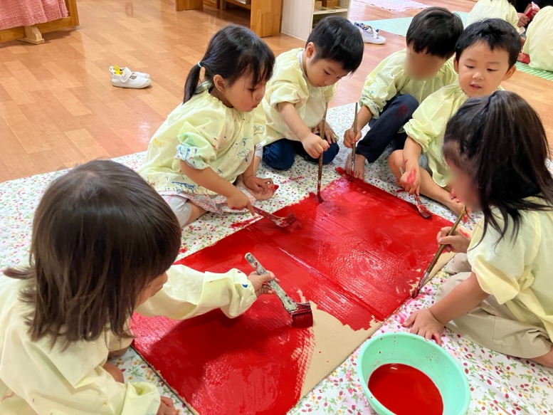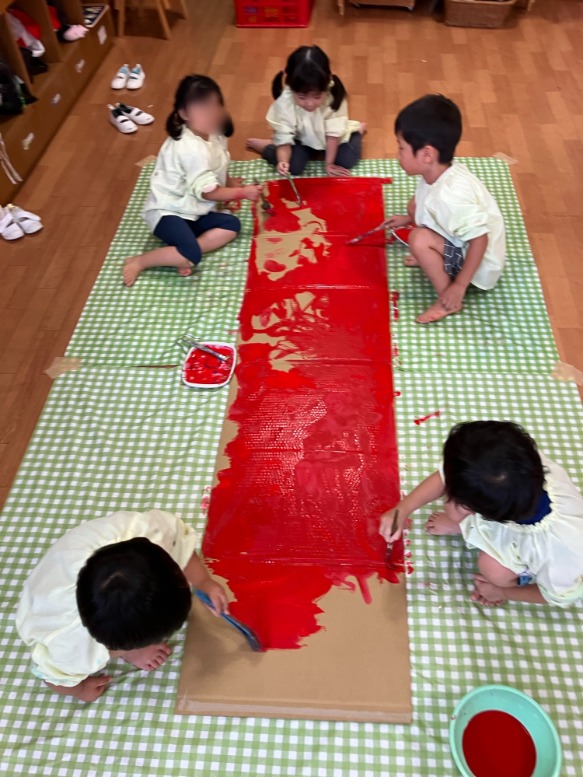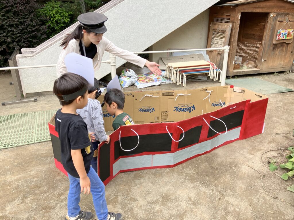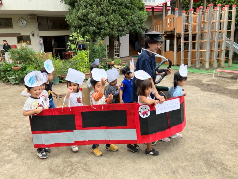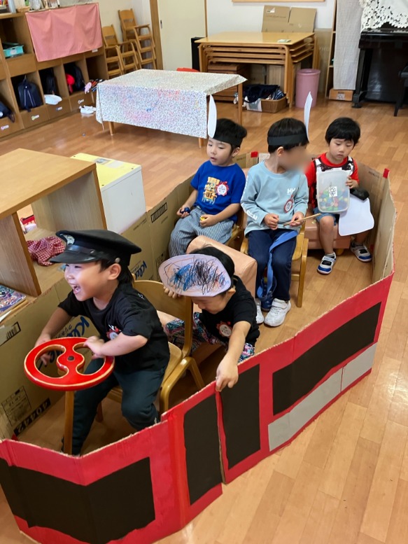 あそび大会に向けて(年少組) 毎日の保育 2025.10.10 毎日の保育 バスごっこ遊びが好きな年少組は、みんなで大きな東急バスを作りました🚎 絵の具を塗ったり窓を貼ったり、乗車口もあります! クラスみんなが乗れる大きなバスが完成し、お部屋でも園庭でもバスごっこが盛り上がりました。