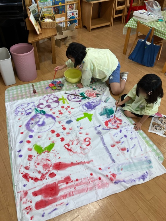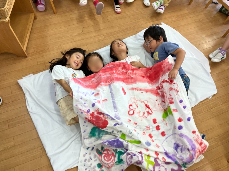 そして、夜みんなと一緒にお布団で寝たことも楽しい思い出です🌟 シーツを敷いて、「キャンプのときは花柄のお布団だったよね!!」と模様も描きました!
