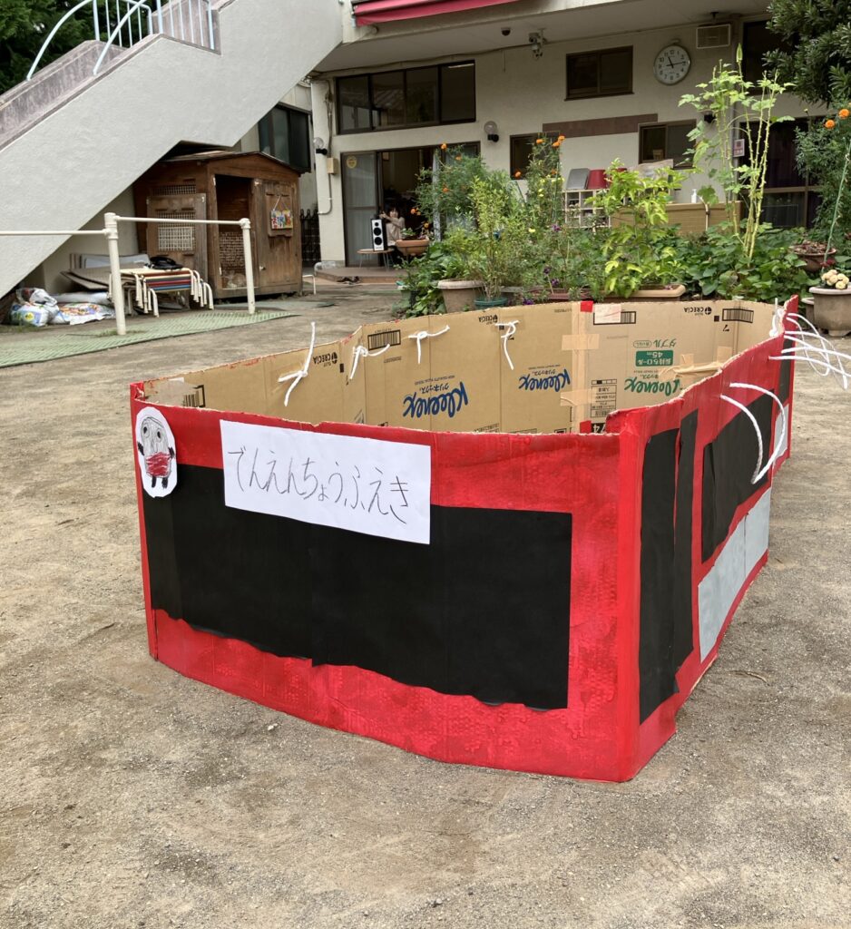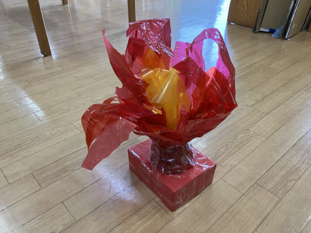 共通体験をしたからこそ、子どもたちから次々とアイデアが出てきました。こちらは、キャンプファイヤーの炎です🔥 なんと、スイカ🍉やニジマス🐟、お布団も作りました!!