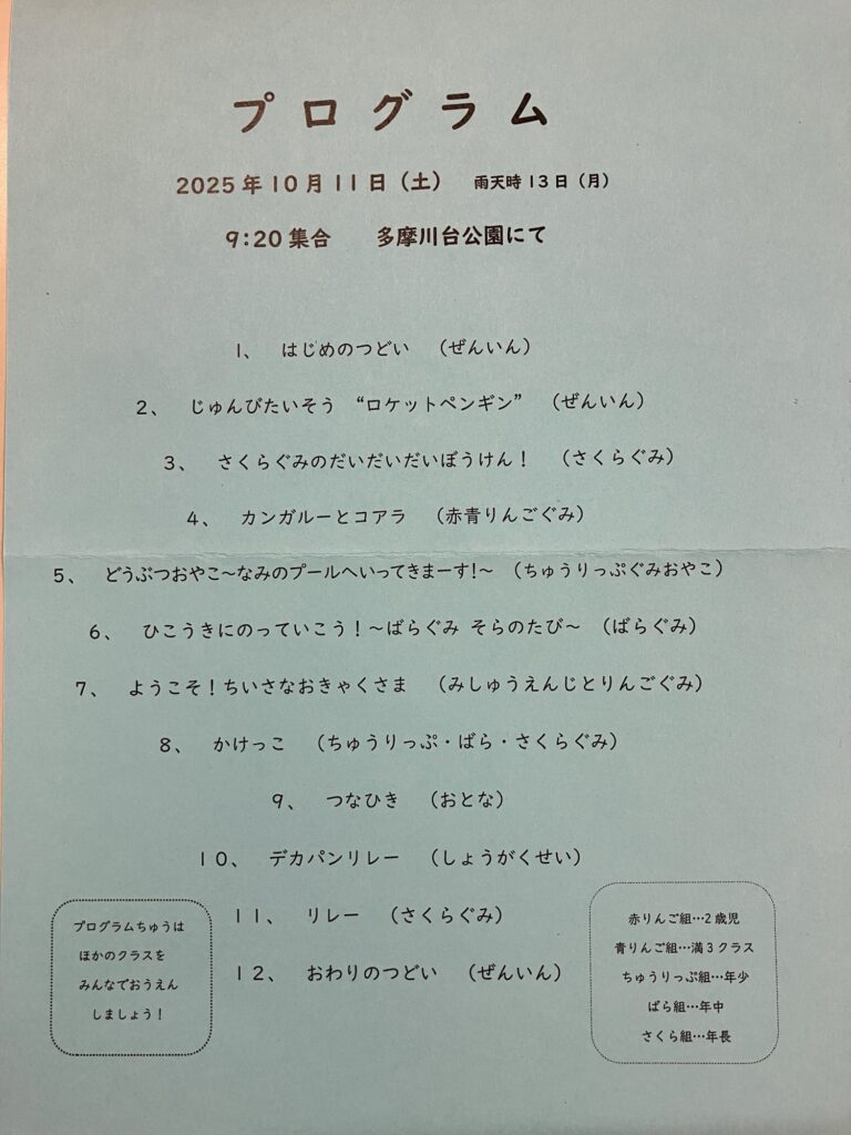 「あそび大会ってなぁに???」と思いますよね。かけっこやリレー、綱引き等、運動会で行うような競技もありますが、何といっても子どもたちが普段楽しんでいる遊びを広い戸外でもできるようにアレンジしてクラス競技となります。普段もいっぱいあそびますが、この日は気持ちの良い戸外で身体をいっぱい動かし、普段のあそびの延長上にみんなであそぶ大会です😊