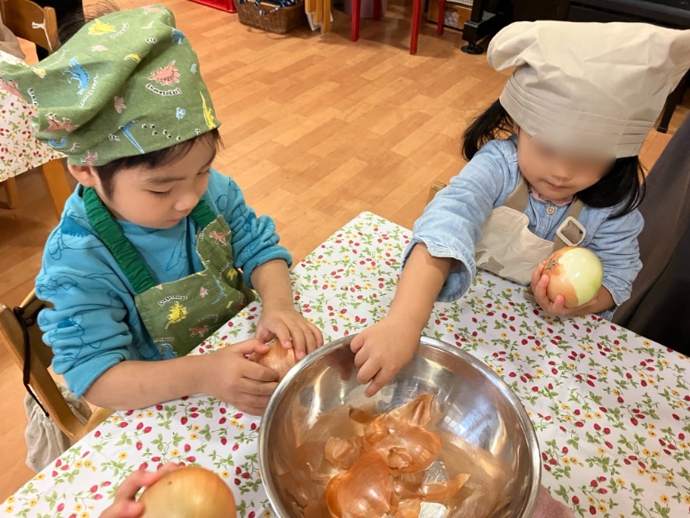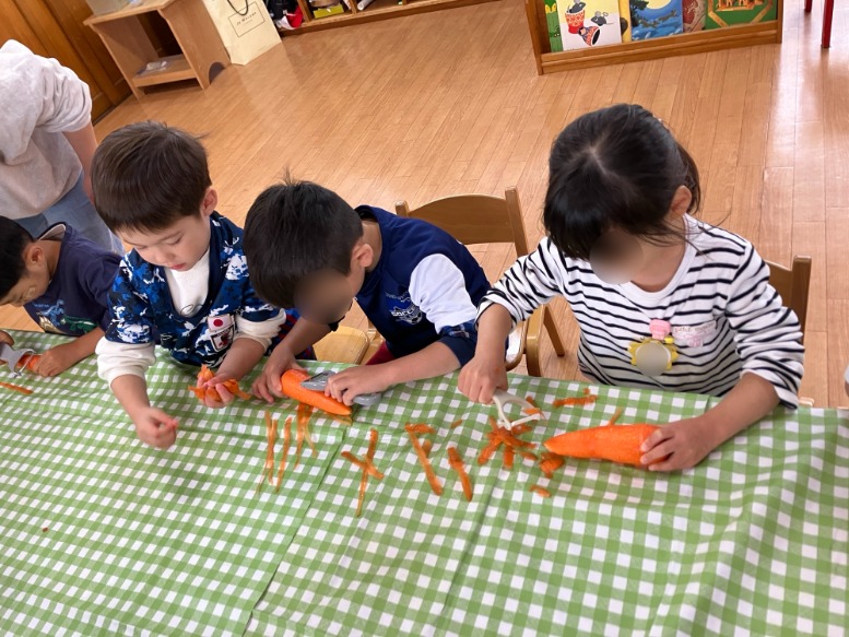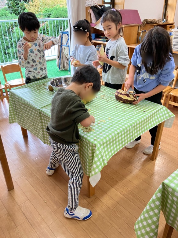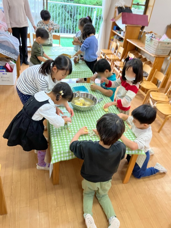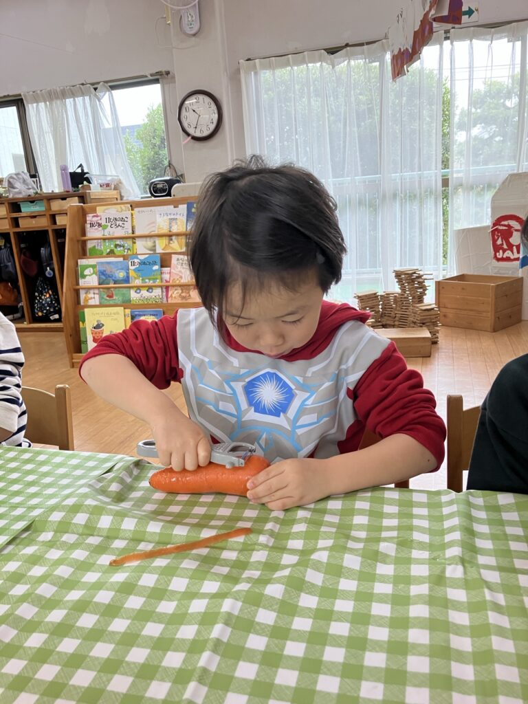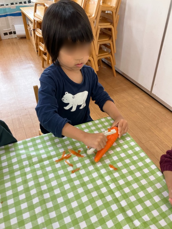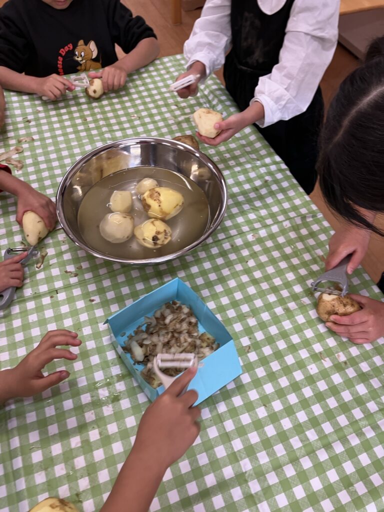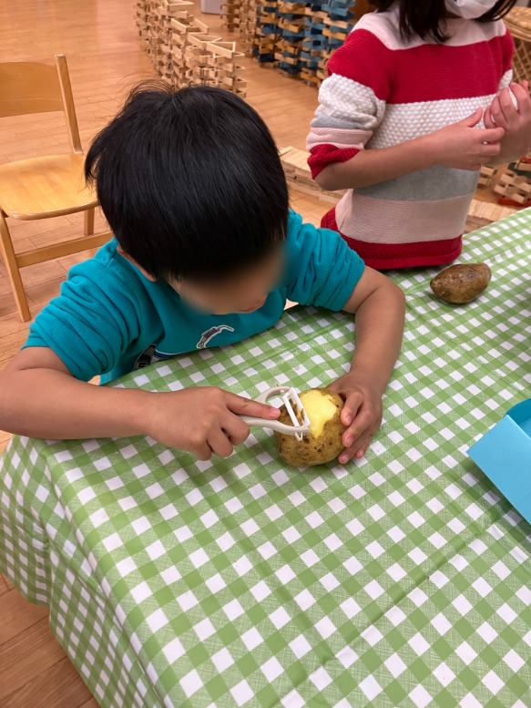 皮むきでは、抑える手✋、動かす手✋を上手に使いました。 ジャガイモは、形が不安定のため子どもたちがやりやすい体制を見出していましたよ😊 立つ、しゃがむ、中腰、足を開いて力を入れる!!