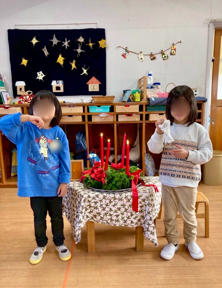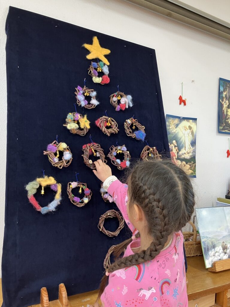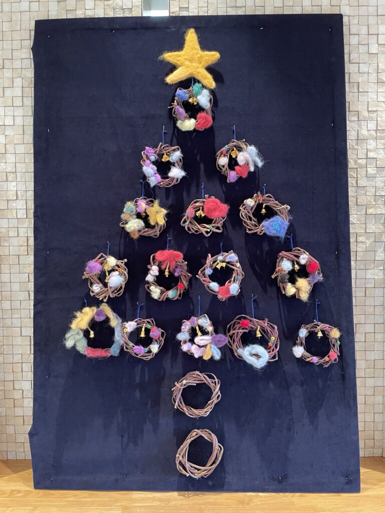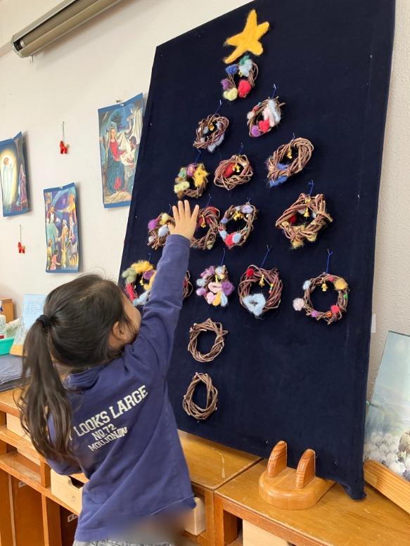 毎日の保育各クラスのアドベントカレンダーがいっぱいになりました。幼稚園では、クリスマス礼拝の日が最後になるように1日1個、飾りました。クリスマスが近づくにつれ、賑やかになるアドベントカレンダーは、「ぼくの番はまだかな? いつかな?」とクリスマスを待つ喜びを経験します。