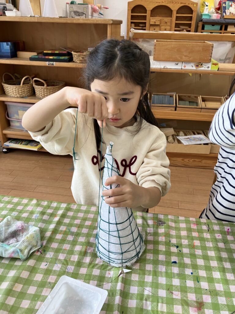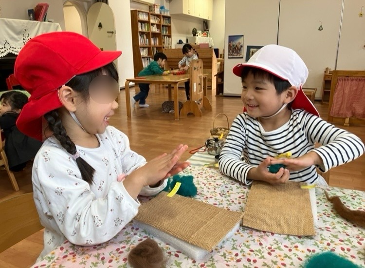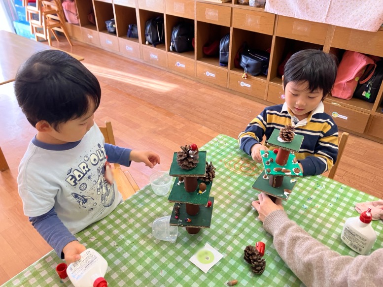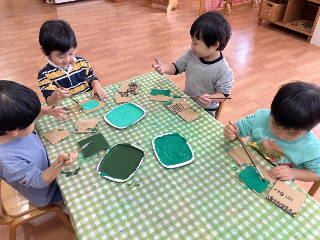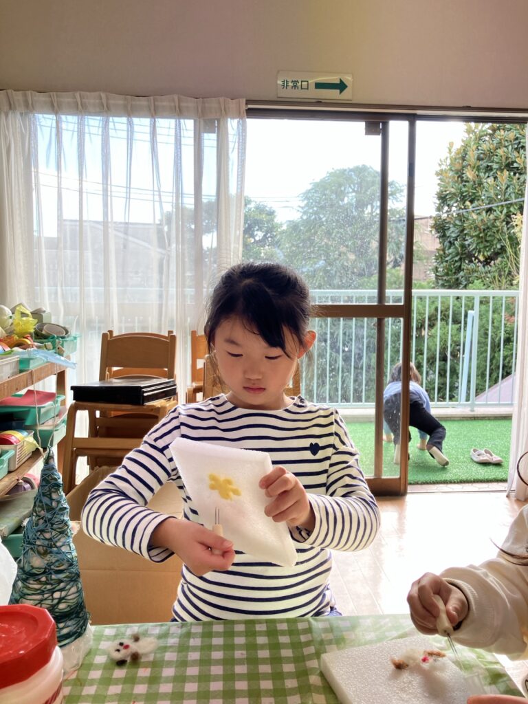 クリスマス祝会では、大好きなおうちの方へプレゼントを贈ります。「せんせい ナイショだからね!言っちゃだめだよ!」 「なんで絵の具いてたらわかっちゃうからきれいに洗っとこ😊✋」 「ママ、ぜったいよろこぶな🥰」