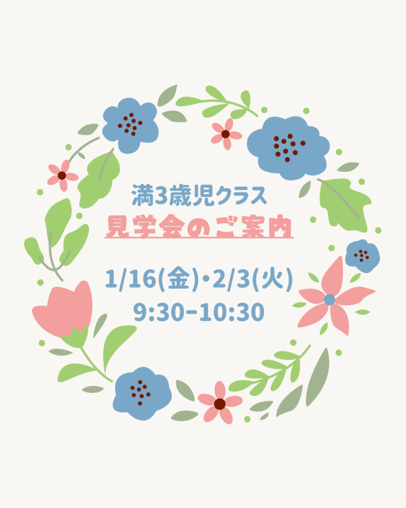 見学会のご案内 お知らせ 2026.01.09 お知らせ 2026年度満3歳児クラスの見学会を開催いたします。 普段の遊びの様子をご覧いただけます。皆さまのご参加をお待ちしております♪ 満3歳児クラスの募集につきましては、HPをご覧ください。