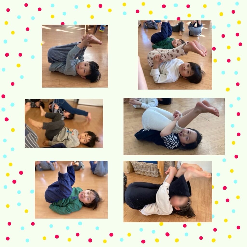 動物ポーズのほか、『ヨガバージョンおもちつき』では仰向けになり、足の踏ん張りでお尻を持ち上げるポーズ。歌に合わせて「ぺったんこ」餅をつき、のびるお餅をイメージして行いました。