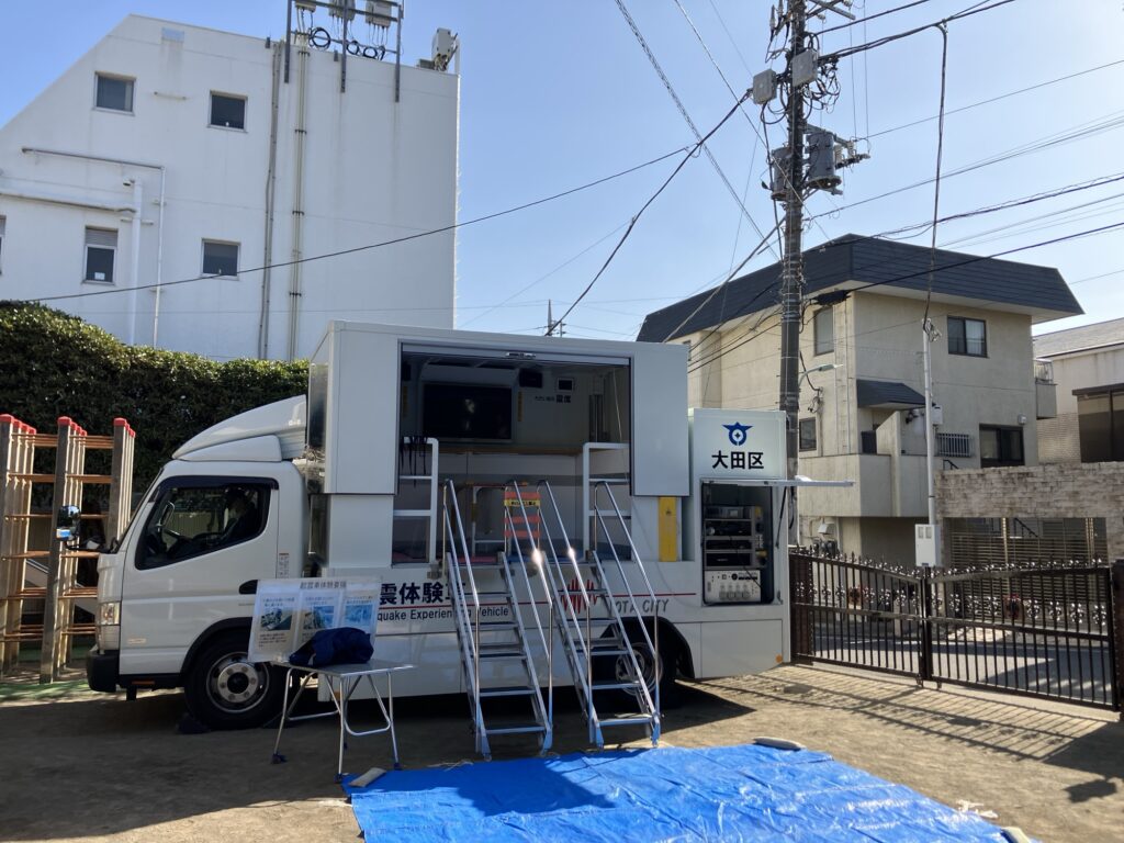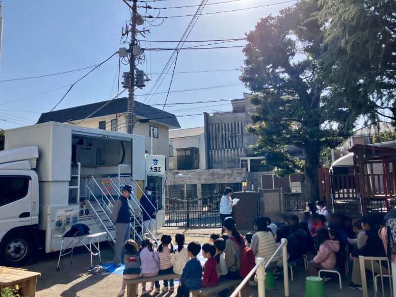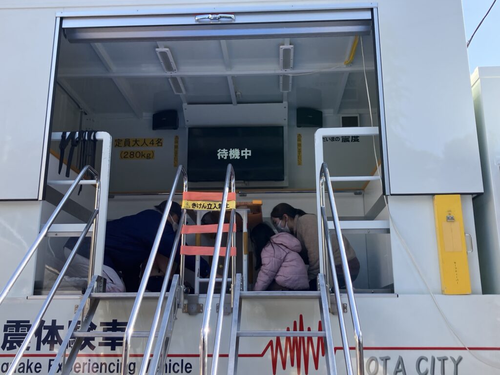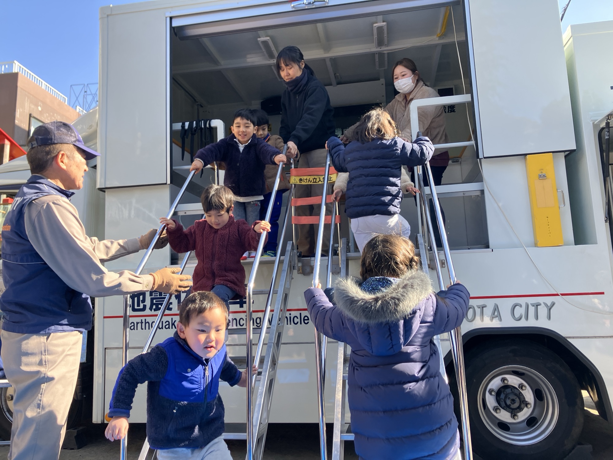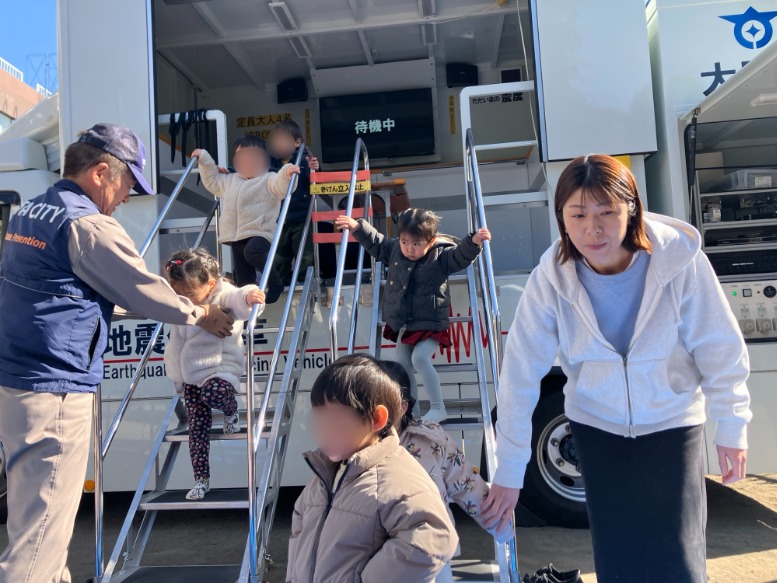 今日は、地震を想定した避難訓練を行いました。いつもと違うのは避難後、起震車に乗り、満3歳クラスと年少組は震度4、年中長組は震度5弱、保育者は震度7を体験しました。