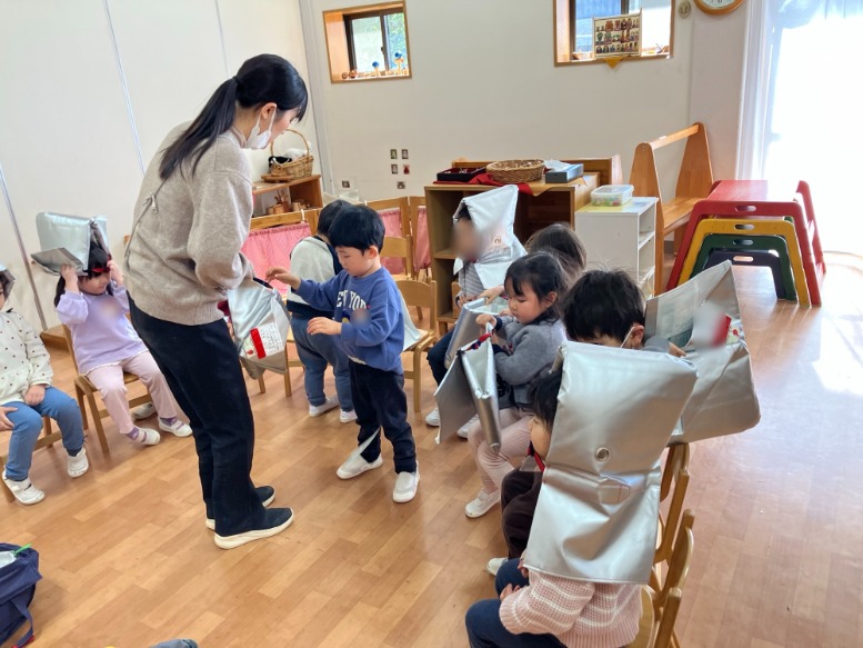 満3歳クラスと年少組は、防災頭巾を被る練習もしました。