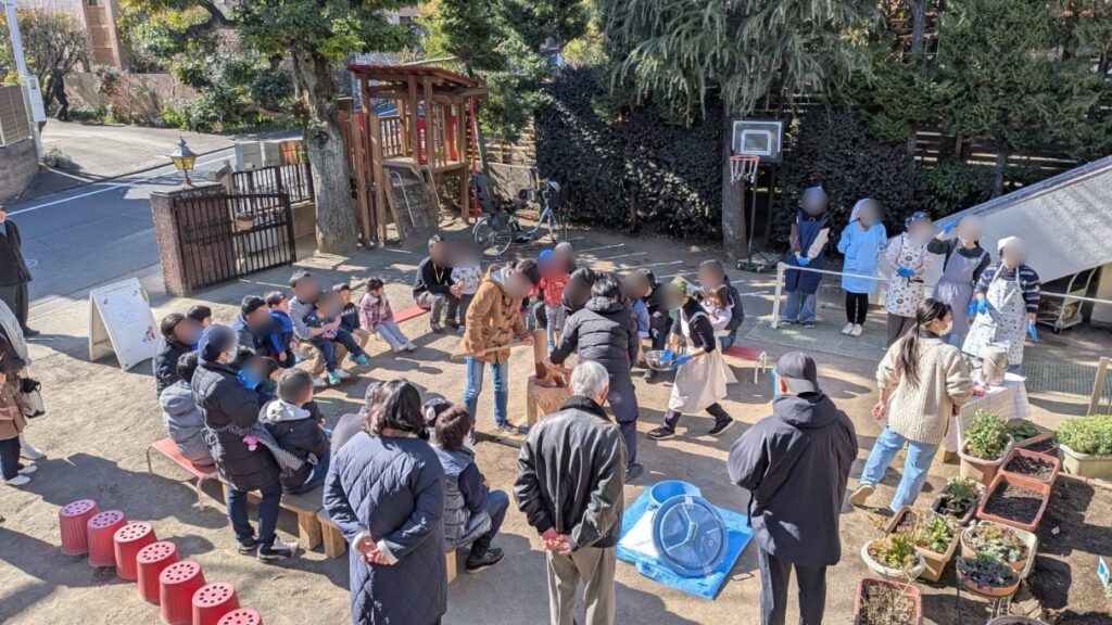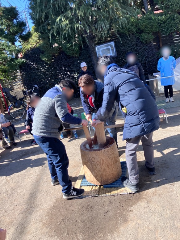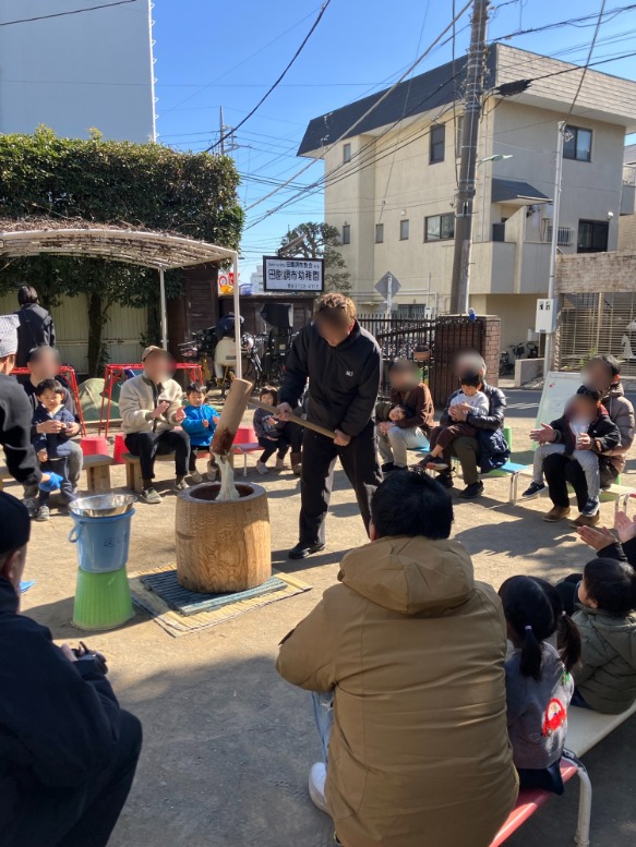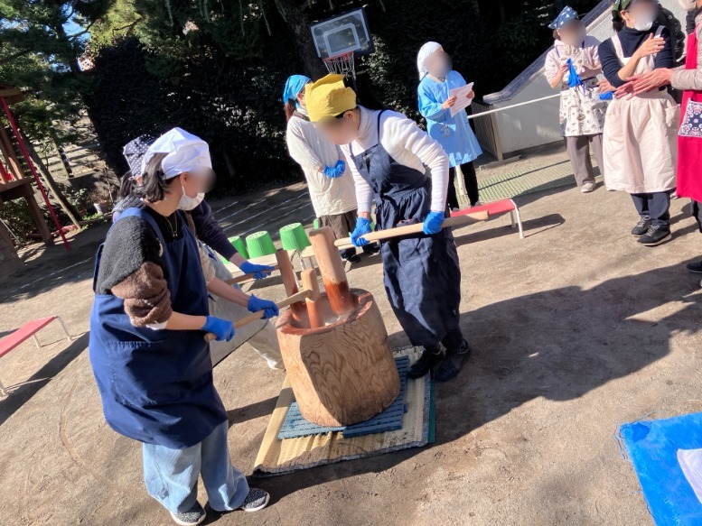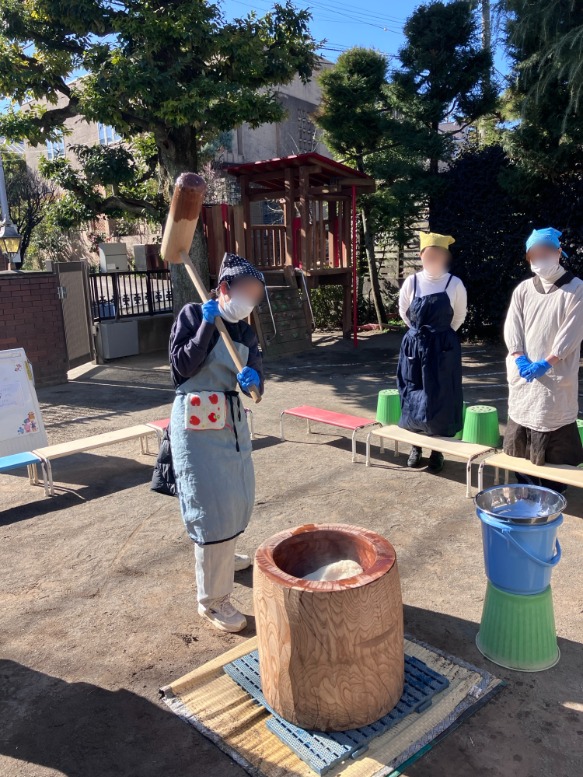 今日は、お餅つきでした。暖かな陽射しの中で、子どもたちの可愛らしい よいしょー! よいしょー! の掛け声が響きました。