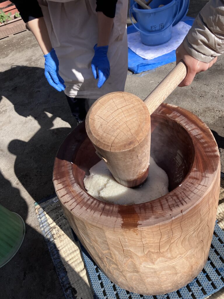 お父さん方が搗いたは、いよいよ子どもたちの番です!