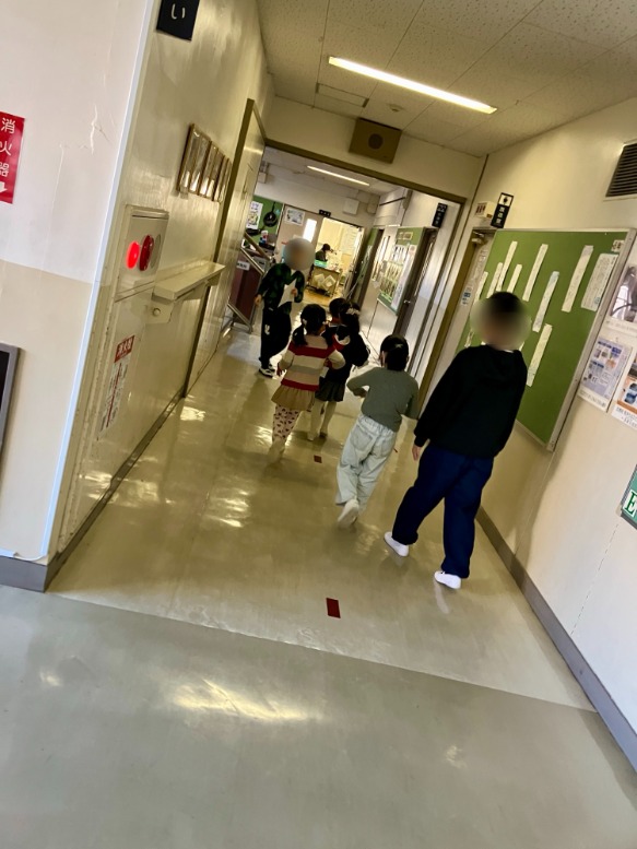 学校へ到着するとお兄さん、お姉さんに迎えられ、教室に行きました。