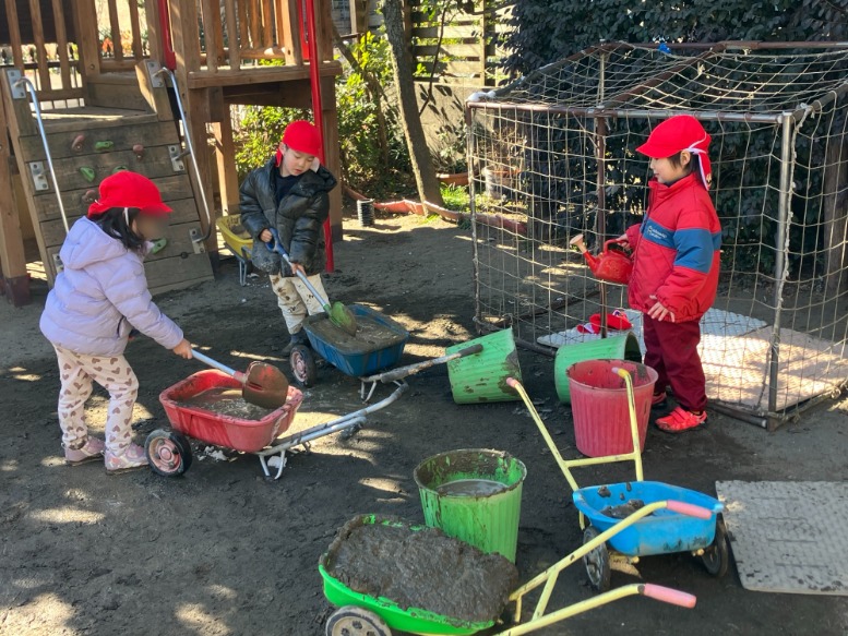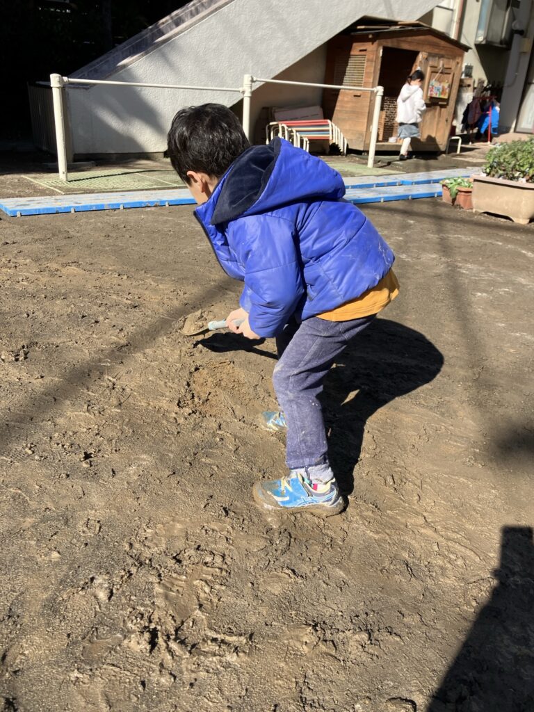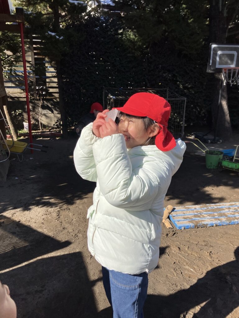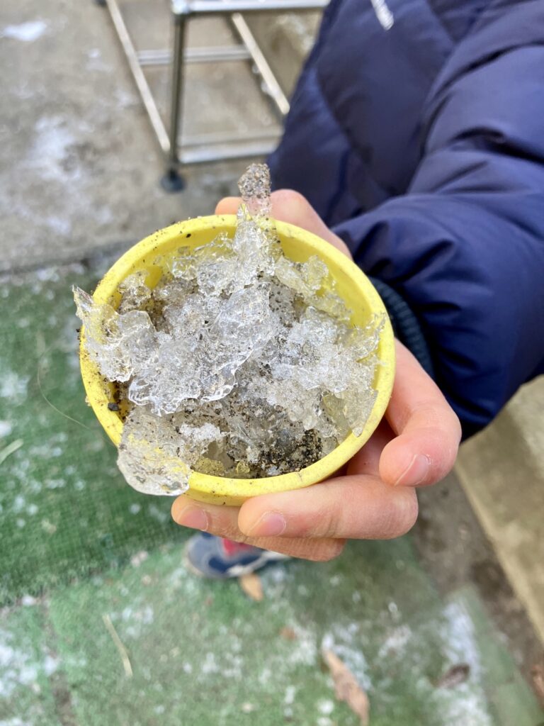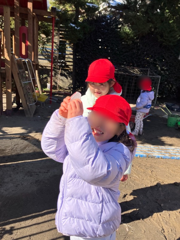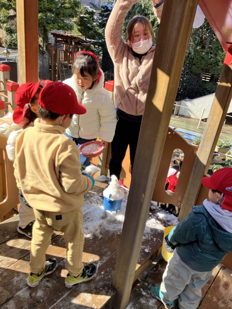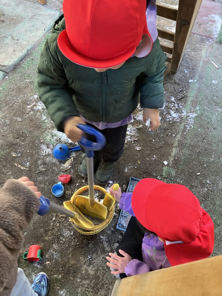 月曜日、朝の園庭は氷🧊探しから始まり、日陰に残っていた雪を集める子、屋根の上の雪をシャベルで取る子、小さなツララを見つけた子👀 ちいさな雪だるまやかき氷を作って、「手が痛い〜😂」と言いながら、普段とは異なる外遊びを満喫しました!