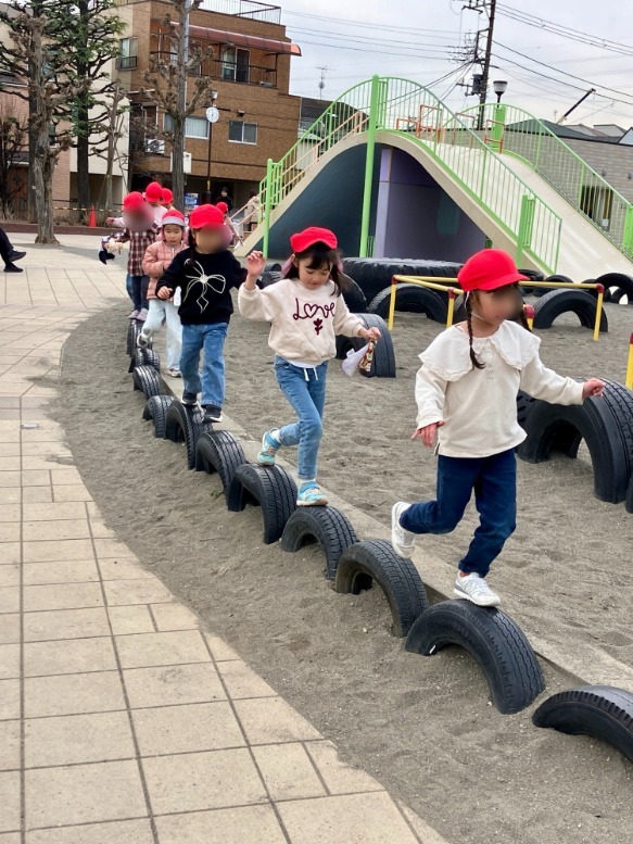 昨日は卒園を控えた年長組とお別れ遠足へ行きました。西六郷公園(通称:タイヤ公園)です。