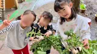 今日は ひな祭り🎎 そして、スープデーでした。すまし汁の具材は、可愛らしい手毬麩、採れたての大根です。雨の中☔年長さんが大根を収穫してくれました。 まるで絵本「おおきなかぶ」のように一人では抜けず、「うんとこしょ どっこいしょ!」3人で引っ...