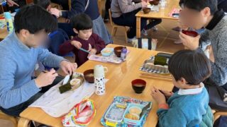 土曜日に行われたおもちつき(食事)の様子です。園庭でお餅つきをした後は、保育室でいただきました。 味付けしたお餅をぞれぞれのカップに入れておき、お弁当箱を持って並ぶお父さま方に配ります。 続いて、お椀を持参したお父さま方が豚汁コーナーへ並び...