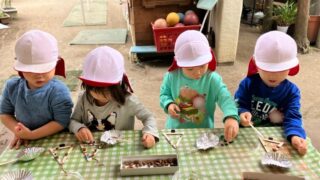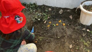 毎日の保育 マリーゴールドの植え替え?! 年中組が育てていたマリーゴールドが11月まで良く咲きましたが、冬野菜の苗を植え替えるため、抜くことにしました。すると、年少さんが砂遊び用に置いた花を植え替えていました😊(笑) 2025.12.08 毎日の保育