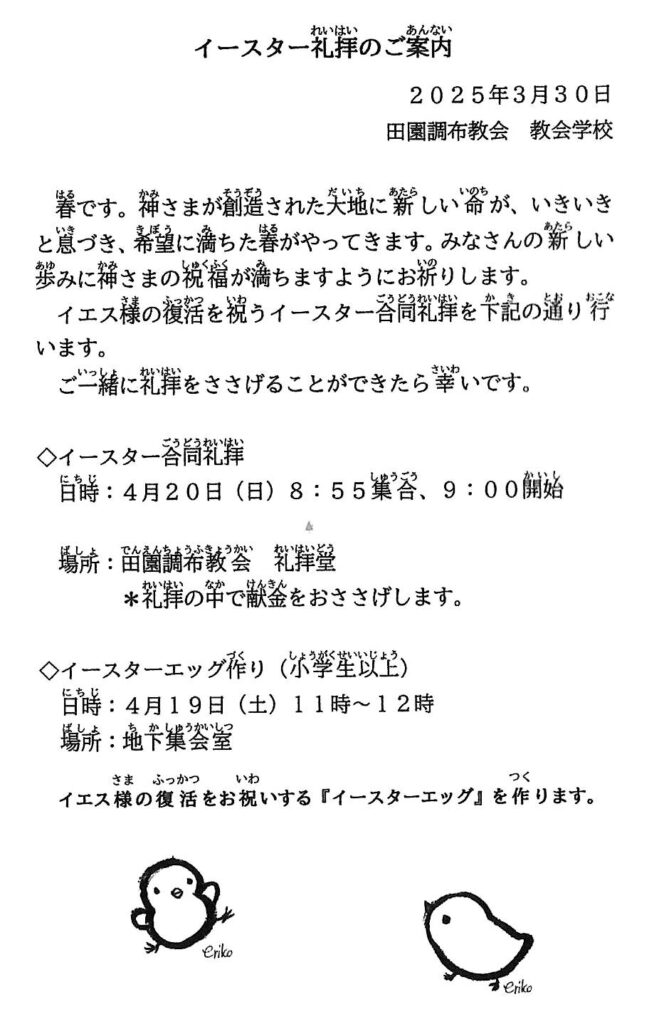 新しい年度になりました。教会学校に通う生徒さんのご家庭にお配りしているプリントです。日曜日にお待ちしています!