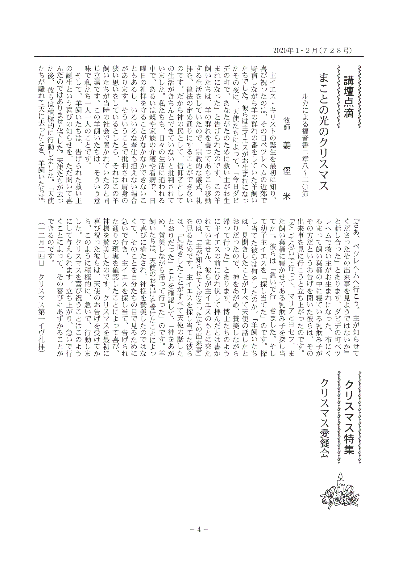 | 2022年1・2月 (740号) | 新生|2ページ|3ページ 牧師 高橋和人 1月2日 新年礼拝・12月19日クリスマス礼拝 | 大きな喜び|後半 牧師 姜 俓米 12月24日 クリスマスイブ礼拝 |