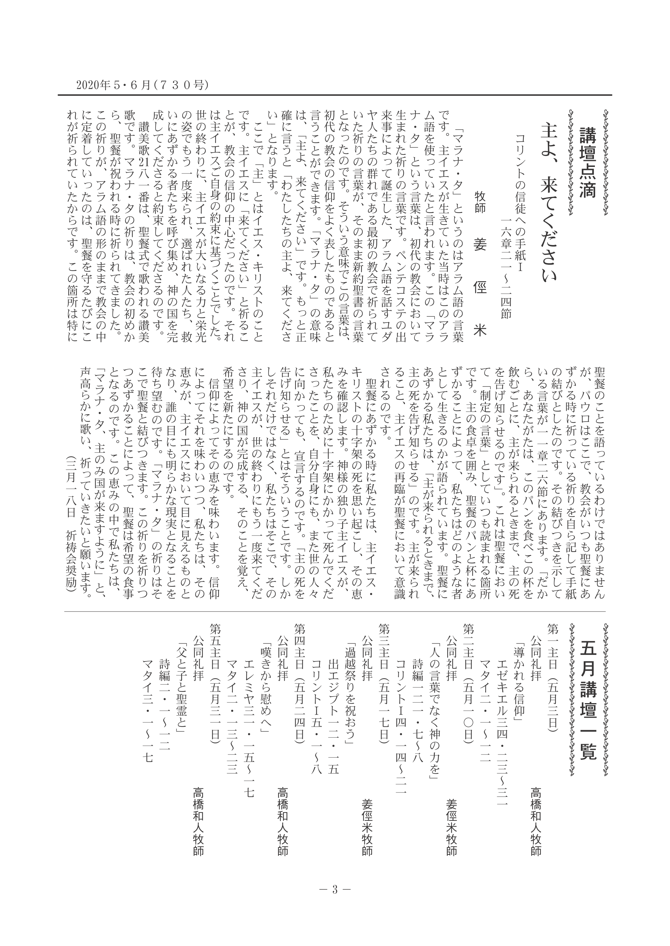 | 2025年5・6月 (760号) | 父への道 牧師 山北宣久 5月18日 夕の公同礼拝 | 伝道旅行に送り出される 牧師 姜 俓米 1月26日 主日礼拝 |