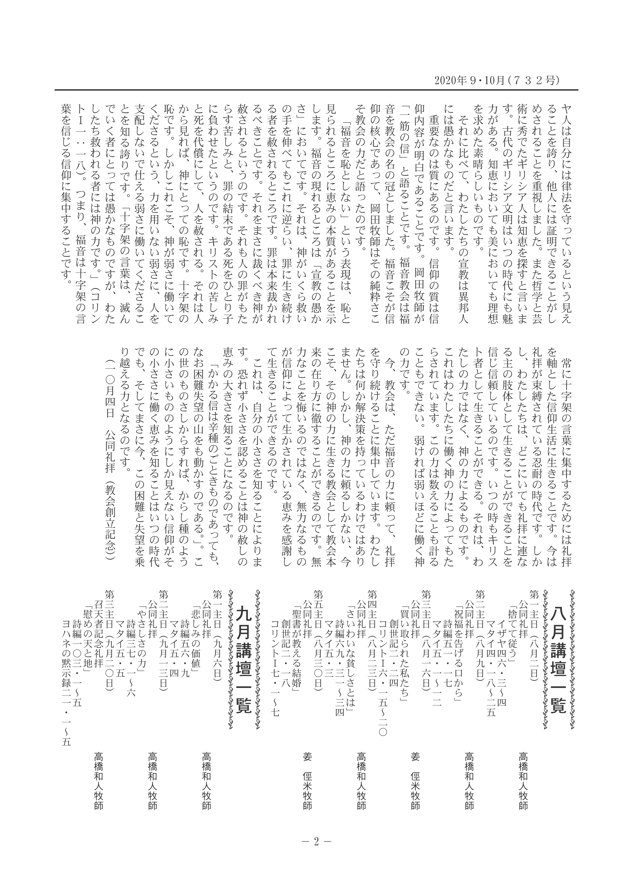 | 2025年9・10月 (762号) | 毒麦のたとえ 牧師 山北宣久 9月7日 夕の公同礼拝 | 主の恵みによって 牧師 姜 俓米 6月22日 主日礼拝 |